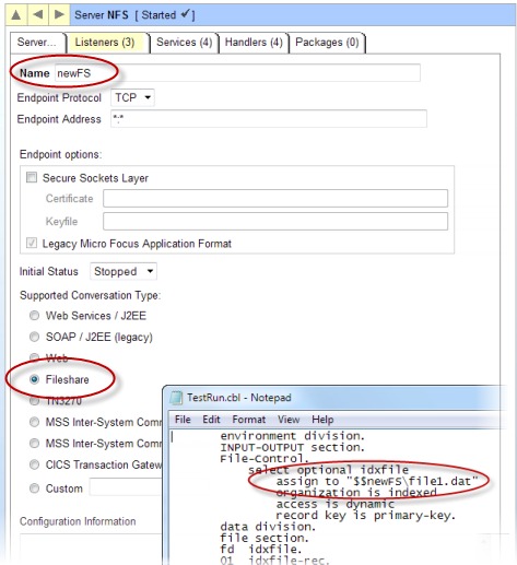 To expose the iFileshare server to users outside of the Enterprise Server, you must create a fileshare listener for the iFileshare server region; this must have a different name to the name of the region. You can then send your I/O operations via the iFileshare server using the $$<listener-name> syntax, or by creating a file handler redirection module configuration file (see Configuring Your Fileshare Client).