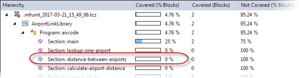 Notice that the Section: distance-between-airports entry is showing 0% covered.