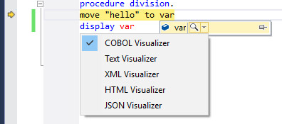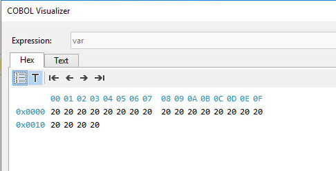 The COBOL visualizer is a window in Visual Studio that you can use while debugging. It enables you to view and edit COBOL data in either hexadecimal format or as text.