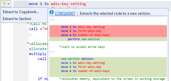 Executing this command replaces the selection a perform new-section statement. It also adds a new section called new-section.