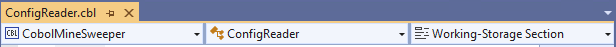 - The navigation bar at the top of the COBOL editor displays the current project and file, and drop-down list showing the current